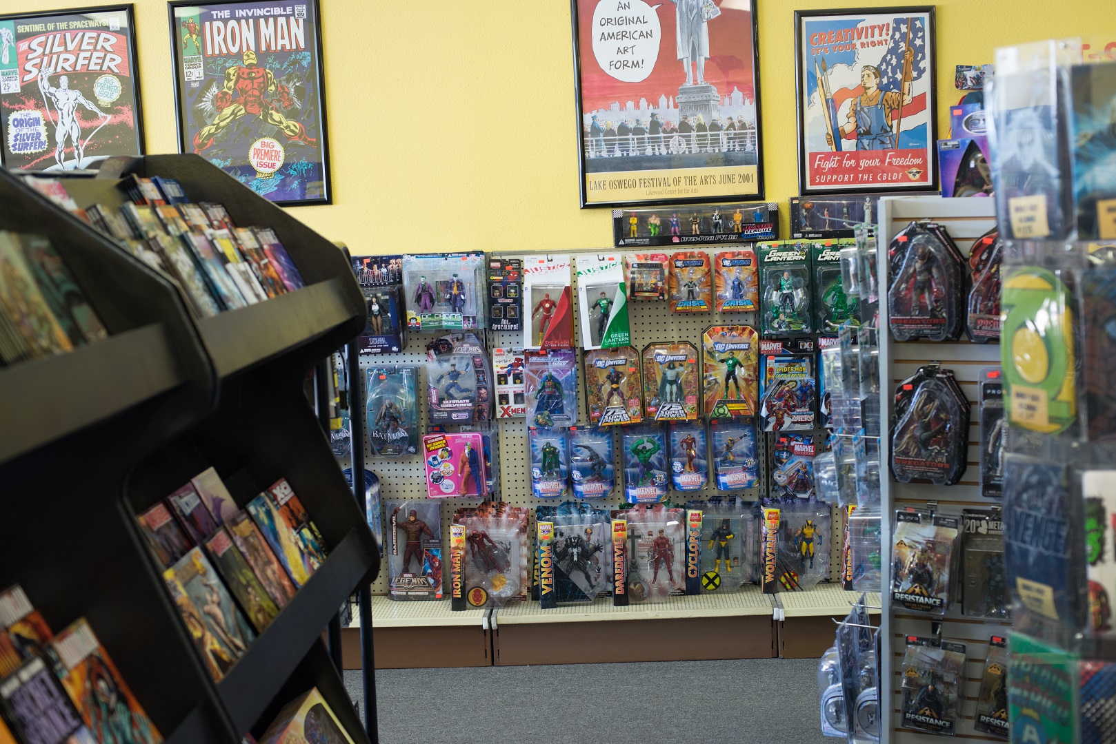 Directly adjacent to our new comics is our selection of Action figures. This consist mostly of comic book related figures, but we also occasionally stock game figures, movie and TV tie ins and other figures of interest.